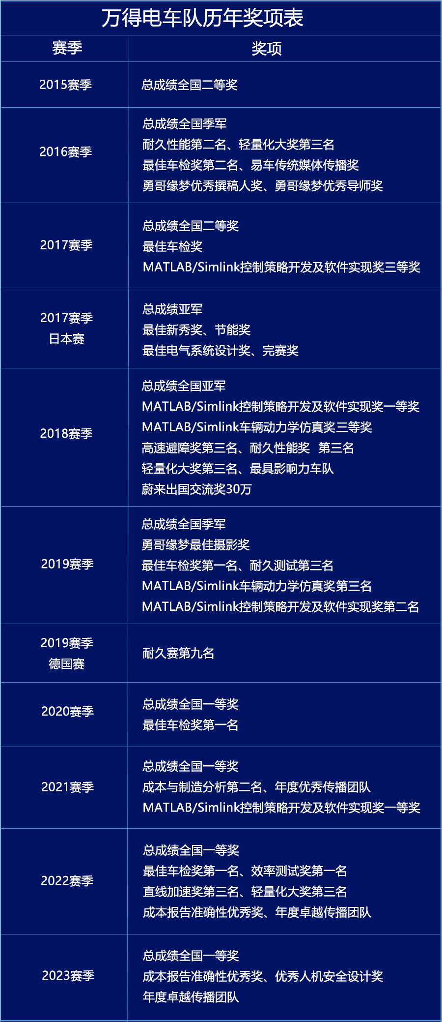 十年来,在各位指导老师和历届队员的共同努力下,万得电车队在国内外多项赛事中屡创佳绩,已成为国内具有一定实力与影响力的大学生汽车创新团队。