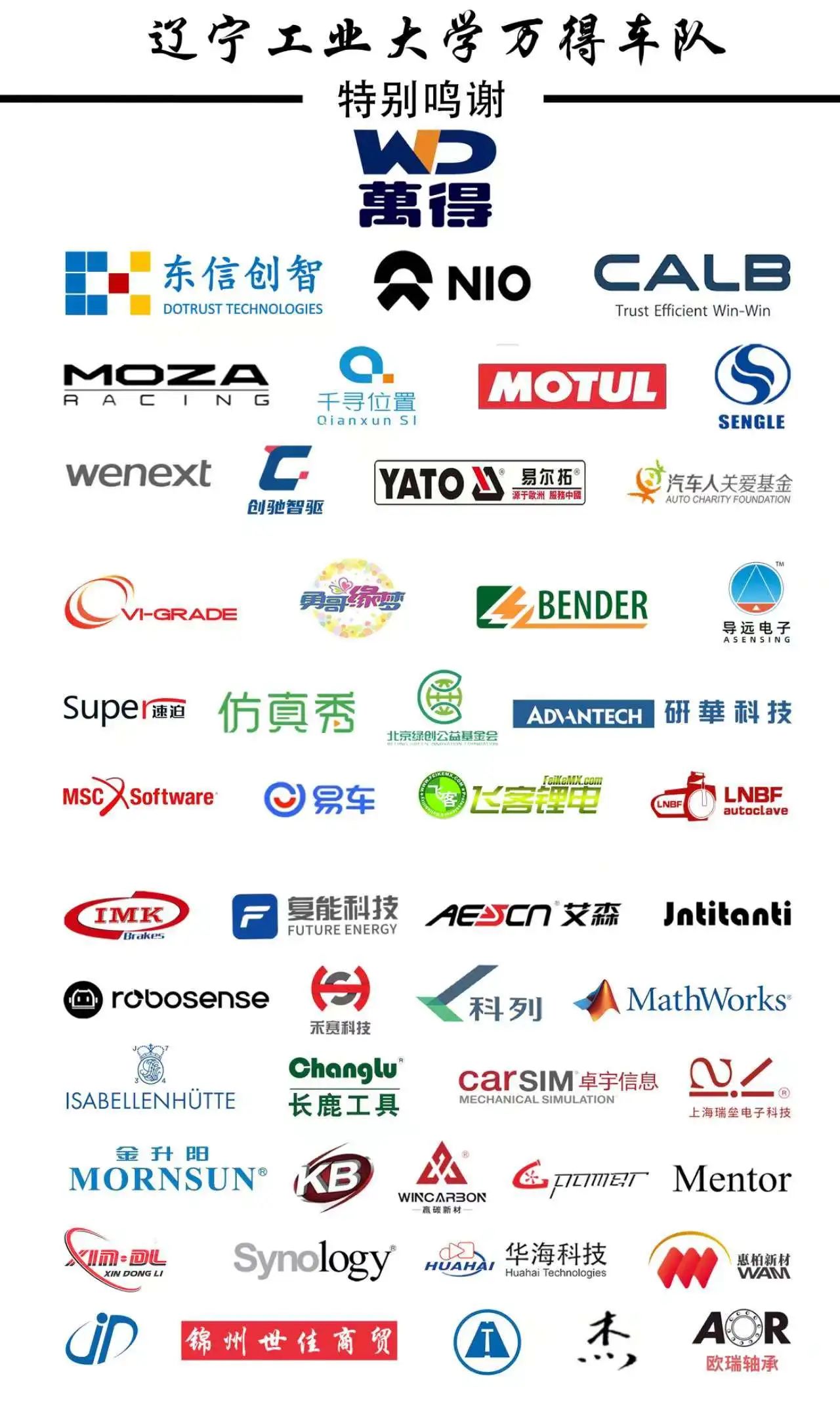 万得电车队成立于2014年11月,是一支由车辆工程及相关专业的本科生与研究生组成的大学生科技创新团队。车队以“万得电车,万分努力”为口号,队员们从无到有,从弱到强,用智慧和汗水将万得电车队打造成一支国内强队,并致力于将车队建设成一支世界级强队。