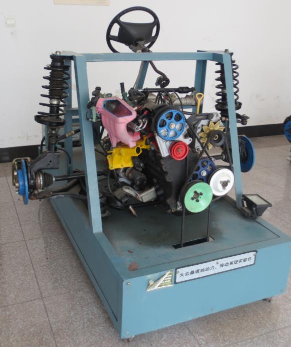 大众桑塔纳动力传动系统试验台采用国产普桑车型AFE电喷发动机总成、排挡系统忌成、变速器总成、离合器总成、转向系统总成、前悬挂系统总成、制动系统总成、传动轴总成等制作。减速电机作为动力源驱动发动机运转。配有滚轮钢质支架,可以轻松移动。