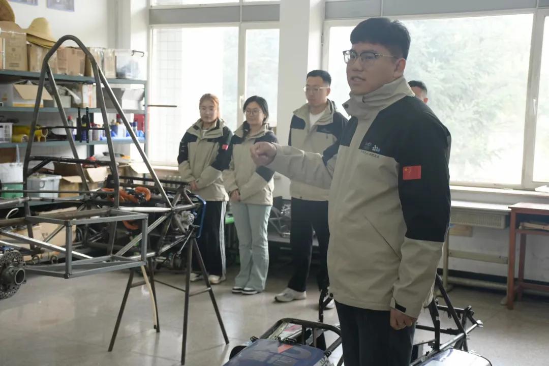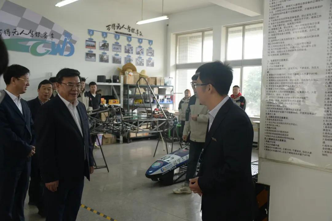 在队员的陪同下,各位领导来到大学生科技创新实验室,张忠洋老师介绍了万得车队的独特之处和技术优势。
