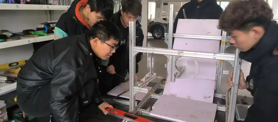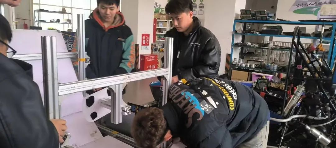 1月14日,队员们不断思索、交流、研究,互相取长补短,在车库一步步搭建人机台架。