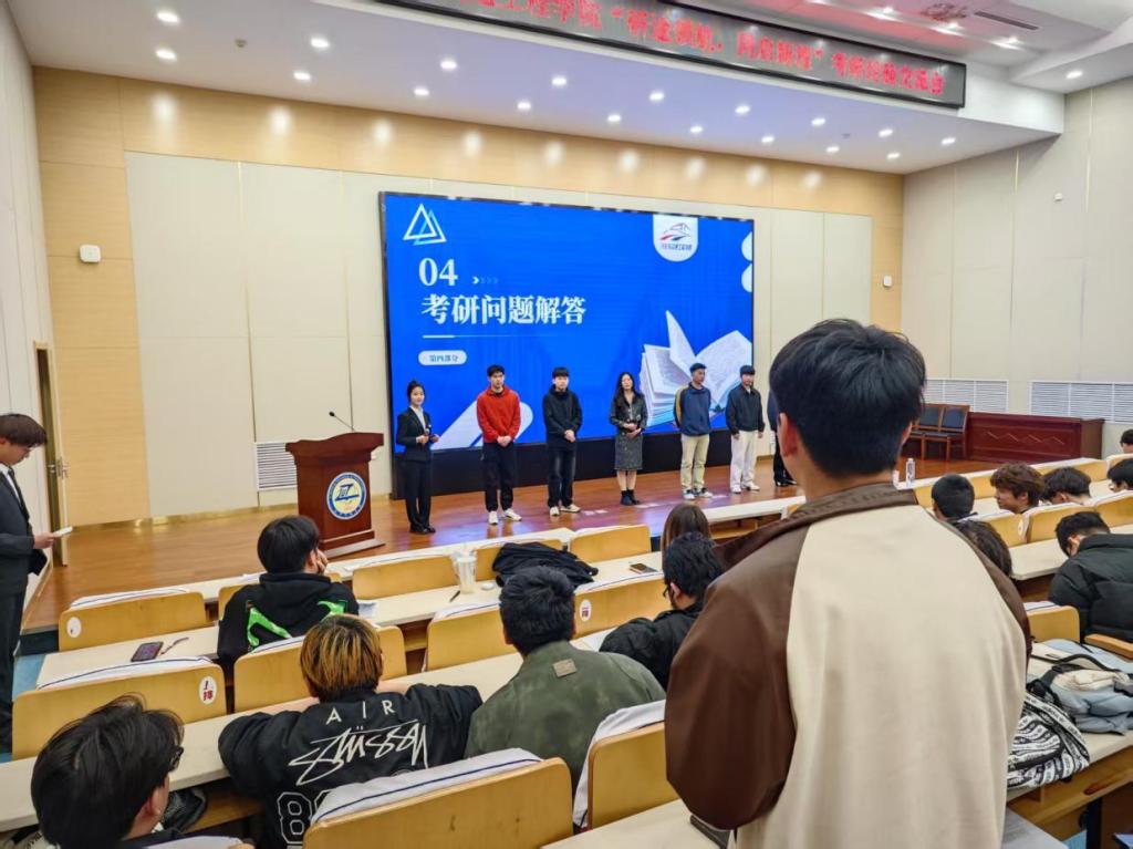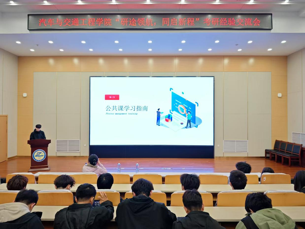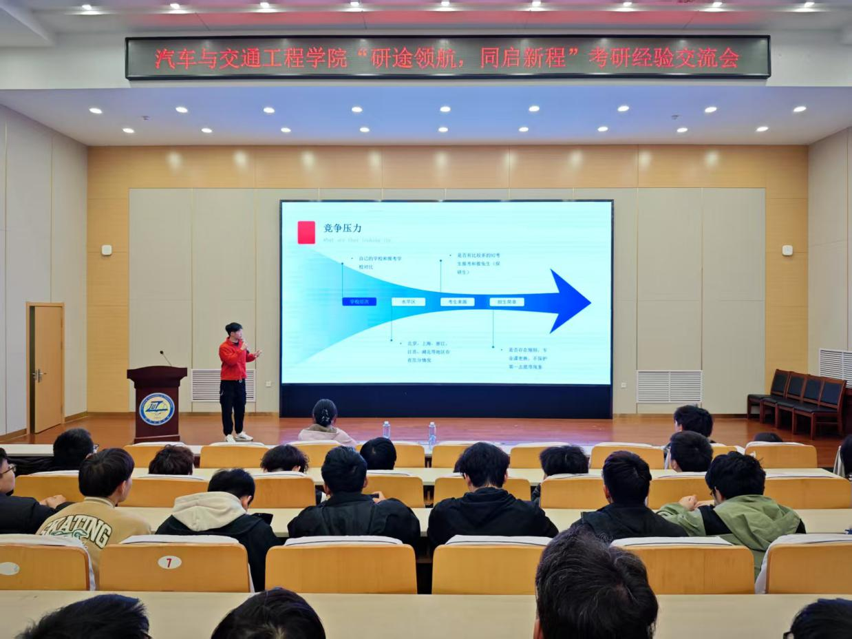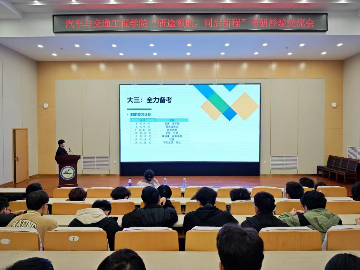 在本次考研经验交流会上,考研上岸学子代表结合自身备考经历,围绕考研复习全过程为同学们进行了深入分析和经验分享。(研)汽车243班姜晓慧从院校选择、应试技巧、心理调适等多个方面进行分享,重点剖析低年级如何加强数学、英语的学习积累,高年级如何提升专业学习能力;交运212班姜阔结合自身考研经历,分享如何平衡学生干部工作与学习关系,合理优化学习时间,同时做到“两手抓”;车辆211班于庆洋以科学规划考研复习作息表作为切入点,建议同学们在备考期间要注重学习效率、保持规律作息,适度放松才能持久作战;车辆212班高震宏结合跨校、跨专业考研的复试调剂环节,鼓励同学们不断提升自主学习能力,积极参加大学生科技创新竞赛,提升自主学习的综合能力;(研)汽车241班岳开元分享了良好的心态对于考研每日学习任务的重要性,讲述他是如何安排学习时间及如何处理考研复习与日常学业课程学习之间的关系;汽服212班陈思余则结合自身经历建议同学们客观评估自身学习基础和学习能力,充分利用本校本专业学科优势平台,合理选择目标院校,避免好高骛远。