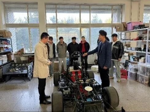 万得车队大学生科技创新实验室。车队队员详细展示了赛车的创新设计与制造工艺,其精湛的技术水平、实践能力和取得的优异成绩赢得了企业专家的高度称赞,他们对学校人才培养效果非常认可。企业专家还参观了新能源汽车底盘与驱动技术重点实验室,较为全面了解了实验室科研条件、科研成果,称赞学院的科研能力和水平。