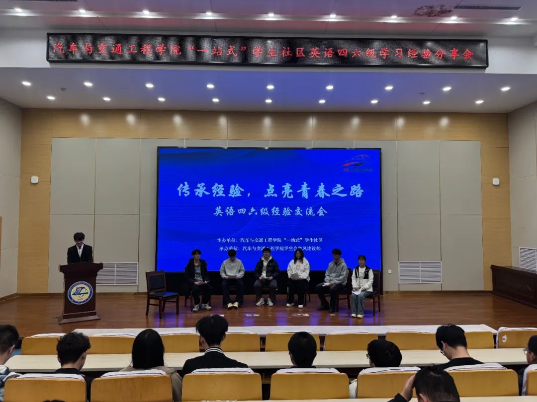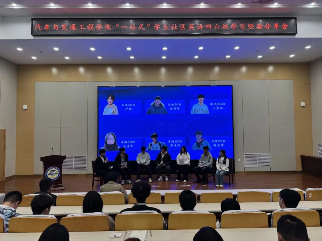 分享会现场,学院2022级交通运输专业毕聪、2023级车辆工程专业马潇坤、2023级汽车服务工程专业郭英坤、2024级交通运输专业顾明智四位同学分别从听力训练、词汇积累、阅读理解、写作和翻译等方面与现场同学进行大学生英语四级学习考试的经验分享;2023级新能源汽车工程专业王雪松、2023级车辆工程专业宋项轩两位同学结合自身备考大学生英语六级经历分别从培养良好学习习惯、合理规划学习时间、英语学习资源分享等方面与现场同学进行经验分享。